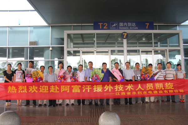 當(dāng)公司援阿富汗項(xiàng)目技術(shù)人員一行走出站口時(shí),受到董事長(zhǎng)、總經(jīng)理王元旦等人的熱烈歡迎,并收到公司員工送上的鮮花。王總飽含深情的說(shuō),你們辛苦了!歡迎你們凱旋,你們?yōu)樽鎳?guó)爭(zhēng)得了榮譽(yù),為江西水建爭(zhēng)得了榮譽(yù)!