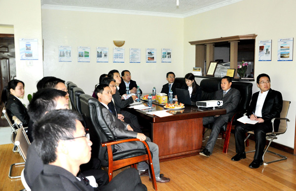 集團(tuán)資訊 當(dāng)?shù)貢r間2015年7月16日,中國駐肯尼亞經(jīng)濟(jì)商務(wù)處參贊郭策一行到我司肯尼亞分公司調(diào)研??夏醽喎止究偨?jīng)理賀翔、副總經(jīng)理彭紅軍及相關(guān)人員迎接并陪同調(diào)研。