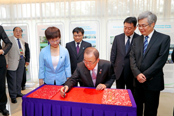 潘基文表示,國際小水電中心是中國與聯合國開展南南合作的典范,是習近平主席倡導和支持的南南合作的杰出代表。潘基文為國際小水電中心題詞:“Small hydropower is an important renewable energy. I hope the International Center on Small Hydro Power (ICSHP) continues to make great contributions to the development of small hydropower worldwide.”