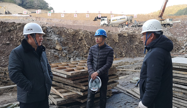 在上游水庫,董事長王元旦深入施工現場各施工作業面,仔細查看現場安全文明施工情況,對工程質量及施工進度進行了詳細了解,并就工程建設實際情況與項目負責人、現場技術員深入交流,提出了指導意見。董事長聽取了項目部負責人對各施工項目的后續計劃安排,對項目部在開工三個月以來取得的各項工作成績給予了充分肯定,同時提出了具體要求:一是要繼續加強施工現場工程質量的管控,加強施工現場安全管理;二是要加強與參建各方溝通協調,在確保質量安全的前提下,加快推進施工進度;三是確保新建隧洞在2021年2月20前通水,確保整個項目保質保量按期圓滿完成。