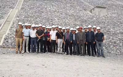 學習團第一站是大麥西項目,項目負責人熊錦江帶領大家參觀了項目營地并對項目營地規劃建設、布置原則,水電解決方案等作了介紹。學員們隨后又參觀了油料庫、鋼筋加工、砂石料生產系統、混凝土制拌系統、上壩公路、導流涵管、溢洪道及主壩施工區,項目負責人給學員們講解了現場各個作業面的安全預防把控、管理核心、質量控制點、施工工藝程序等。學習期間,學員們和項目部在會議室召開了簡短的座談會,大家觀看PPT并進行交流,通過溝通學員們進一步了解和掌握了大麥西項目的難點要點。