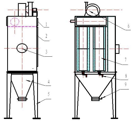 濾筒除塵器是一種比較先進的過濾設備,優點是除塵效率高,設備體積小,過濾面積大,過濾風速低,噪音低等多種優點.被過濾粉塵僅停留在濾料超細纖維層的外表,所以大大減少了過濾阻力,節省耗電30%以上,節能效果顯著,并且清灰十分徹底.同時也解決了超細粉塵,纖維性粉