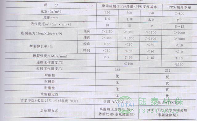 PPS除塵布袋耐高溫、耐酸堿、防水防油性能見表: