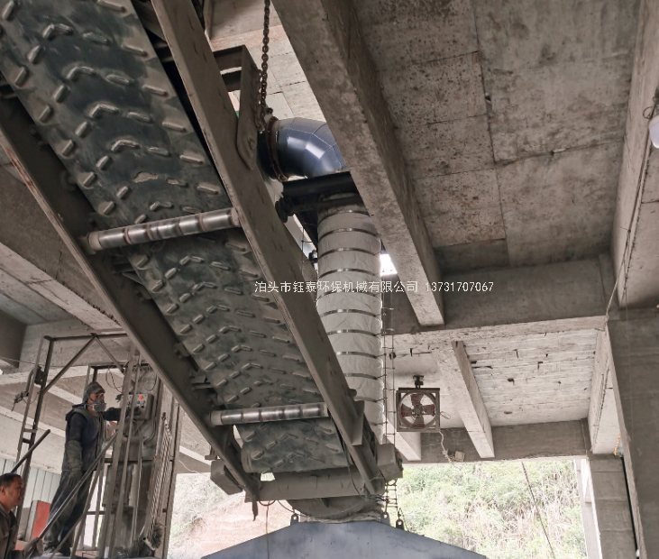 根據袋水泥裝車機生產工藝要求,需要膠帶機前后運行,設計在移動膠帶機車的尾部安裝一臺固定收塵集箱,集箱一側出口連接500mmX500mm可伸縮移動管道,一般可移動伸縮8m長度,把可移動吸塵罩收集的粉塵氣體通過此移動管路輸送到固定管路,再由固定管路將粉塵氣體輸送到除塵器內進行凈化處理,移動管路內部安裝多個滾輪軸承,每節(jié)移動管路上都設有法蘭油浸羊毛氈做為密封,可滿足袋水泥裝車機前后移動運行的要求。