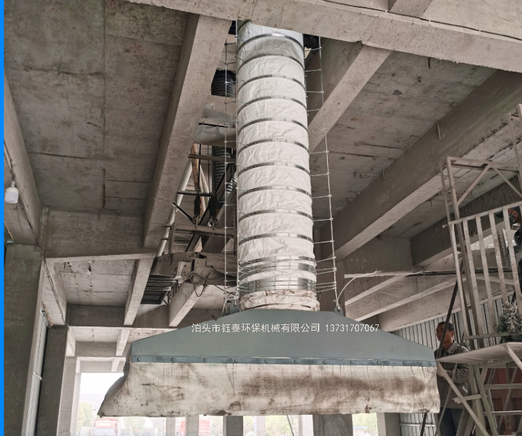 (2)水泥揚塵屬冷態(tài)粉塵空氣氣體,而冷態(tài)空氣再加上水泥粉塵的擴散混合,比重密度增大,根據水泥粉塵空氣的特殊性,要求吸塵罩設計時要有足夠大的負壓,要求吸塵罩口距離塵源800mm之間。